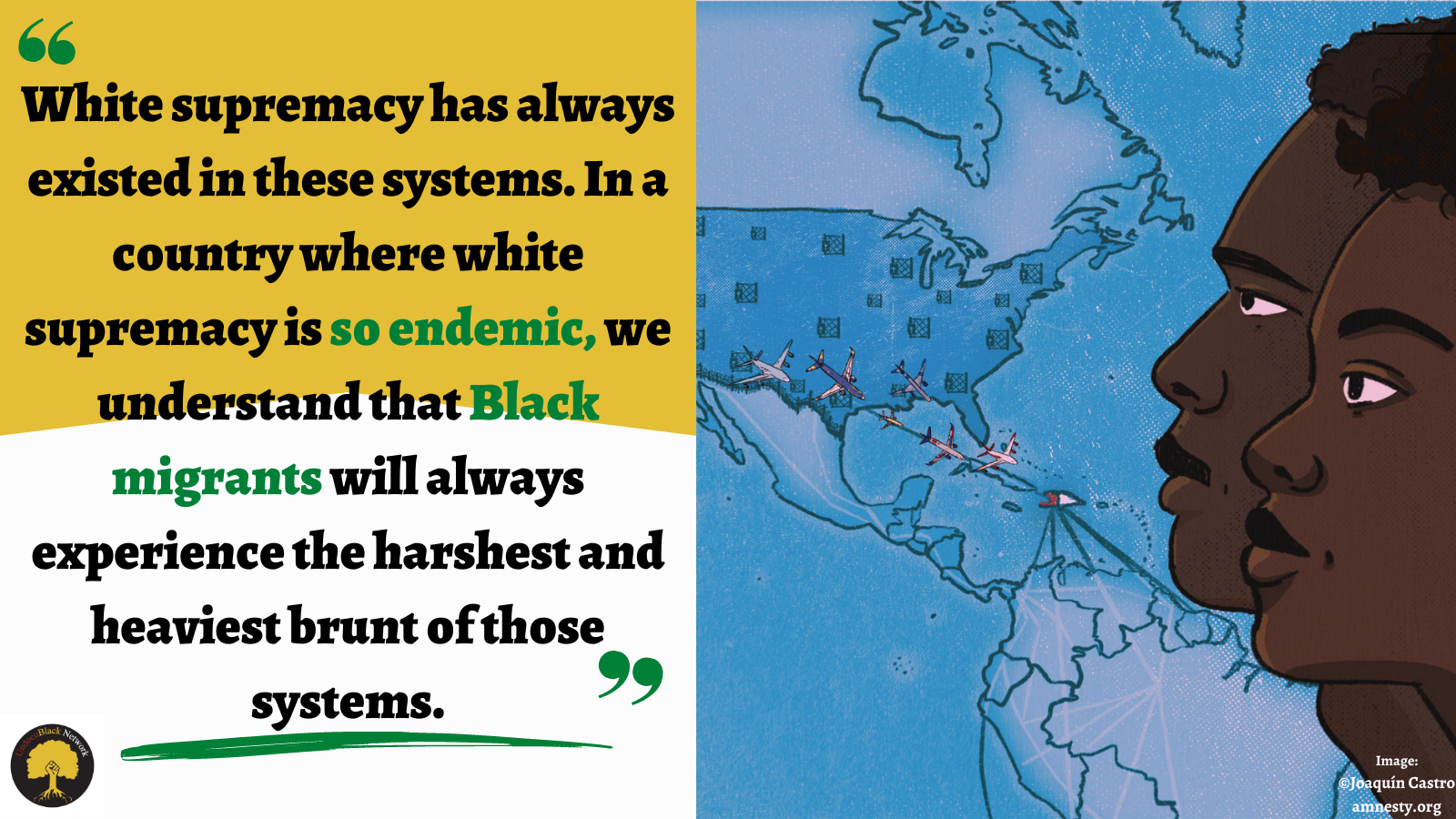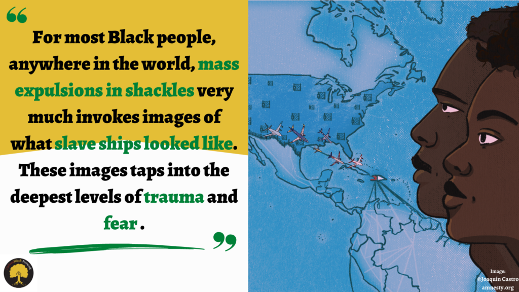 “For most Black people anywhere in the world mass expulsions in shackles very much invokes images of what slave ships looked like. It taps into deepest levels of trauma and fear for Black people. Especially that not knowing part, which happens very abruptly and often happens before they can reach out to an attorney. The historical context and racism, and to see these things replicated over and over again… it is enraging.” – The UndocuBlack Network