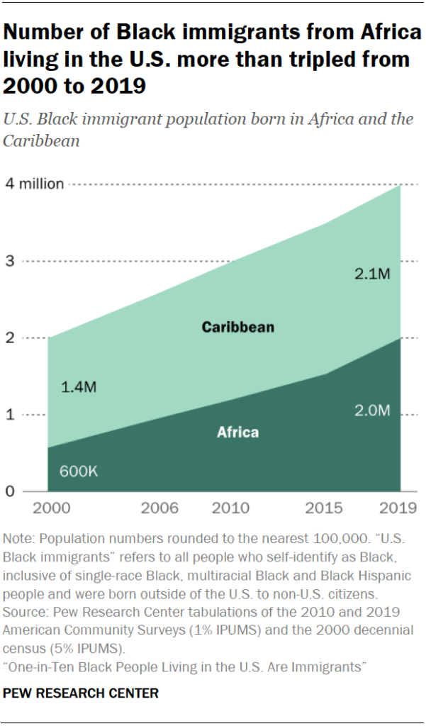 However, Black African immigrants increased 246% between 2000 and 2019, from roughly 600,000 to 2.0 million. Africans now constitute 42% of all foreign-born Blacks, a substantial increase from 23% in 2000.