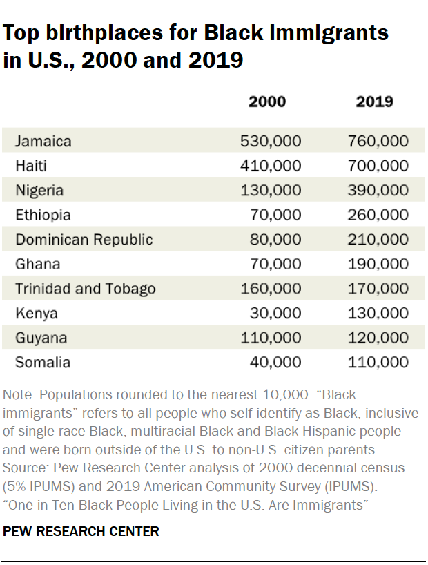 The Pew report notes that while Black immigrants are most likely to come from the Caribbean, African immigrants have the fastest growth rate. Just under half of the foreign-born Black population were born in the Caribbean (46%). Jamaica and Haiti being the two largest origin countries, accounting for 16% and 15% of Black immigrants, respectively.