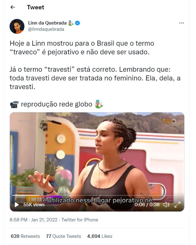 Black trans contestant Linn da Quebrada, schools the other contestants on trans identities: