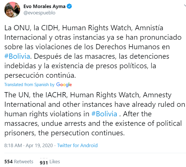 — Evo Morales Ayma (@evoespueblo) October 19, 2020