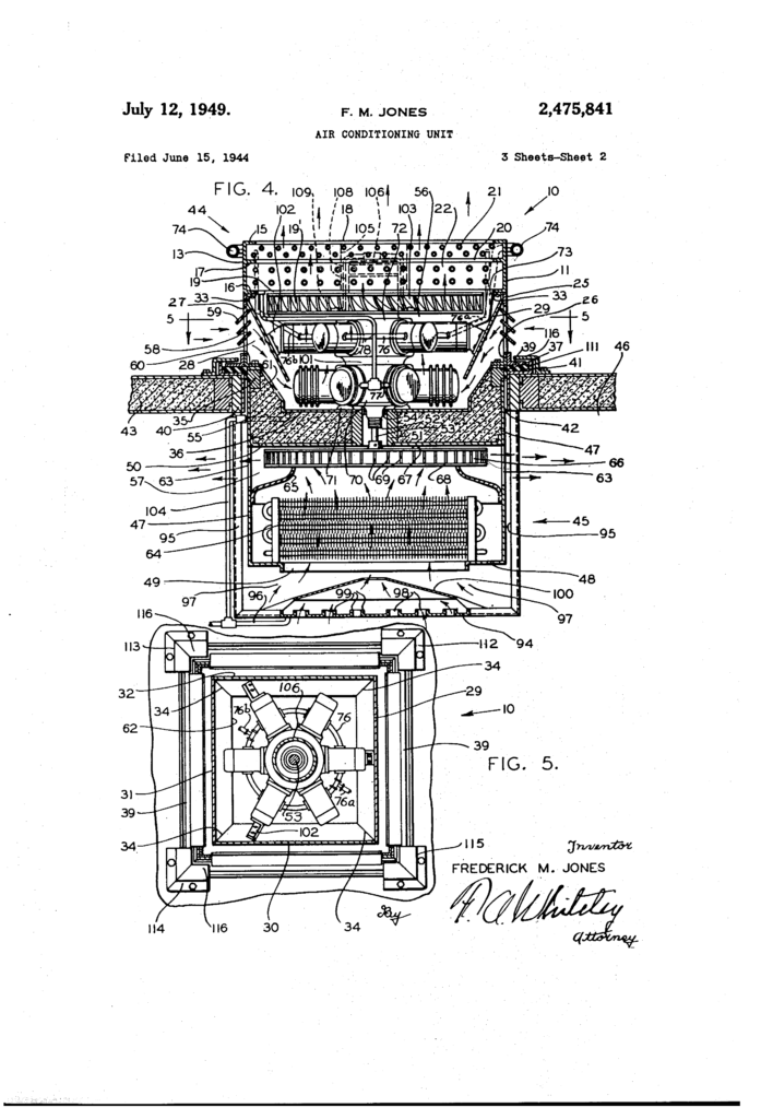 Following his work in cinema, Jones created a small, durable unit to allow for refrigeration in a truck. On the patent application, Jones noted, “my invention relates to an air conditioning unit adapted to be positioned upon and supported by and to extend through the top wall of any room or compartment.”