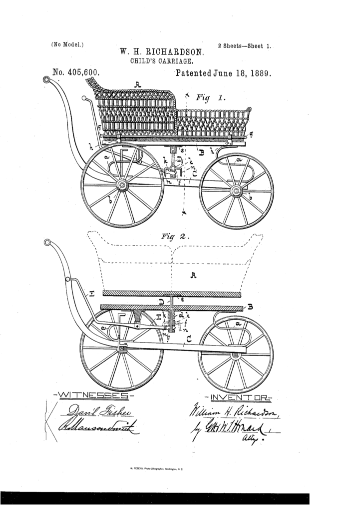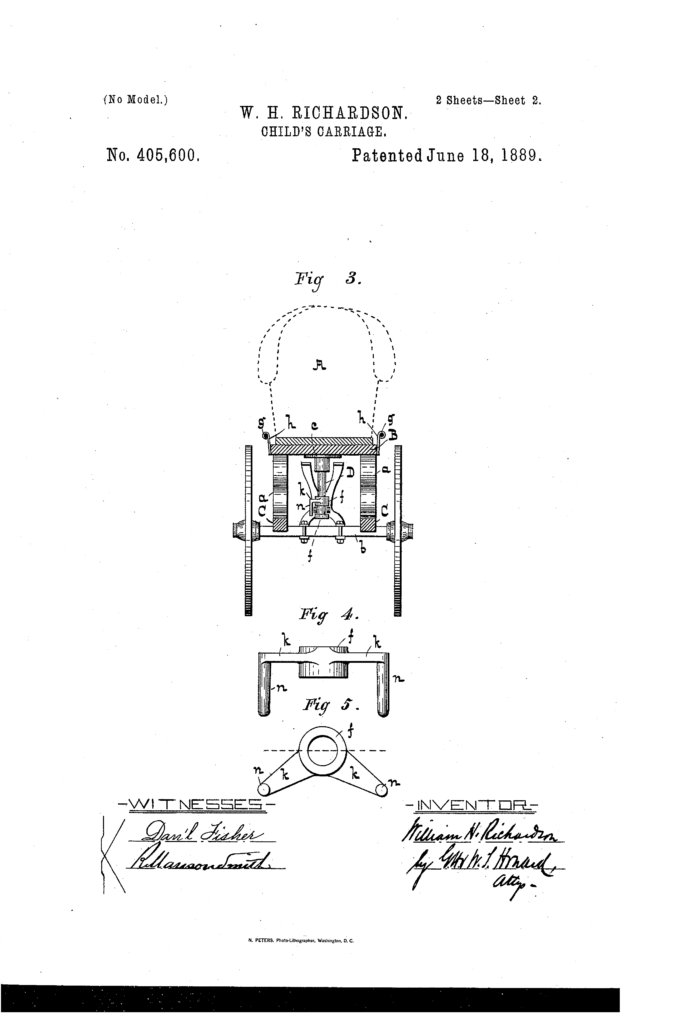 In 1889 Richardson patented a new type of reversible baby carriage that allowed a bassinet to face the individual pushing the device. The design featured wheels that could turn 360 degrees in a smaller turning radius. Richardson’s enhancements also addressed safety concerns about injuries that could result from “a careless and incompetent nurse.” He added that “the object of the present invention is therefore to prevent the complete rotation of the body by providing some part of the moving [mechanism] with a stop.” He applied for the patent on November 12, 1888, and received patent US405600A almost seven months later.