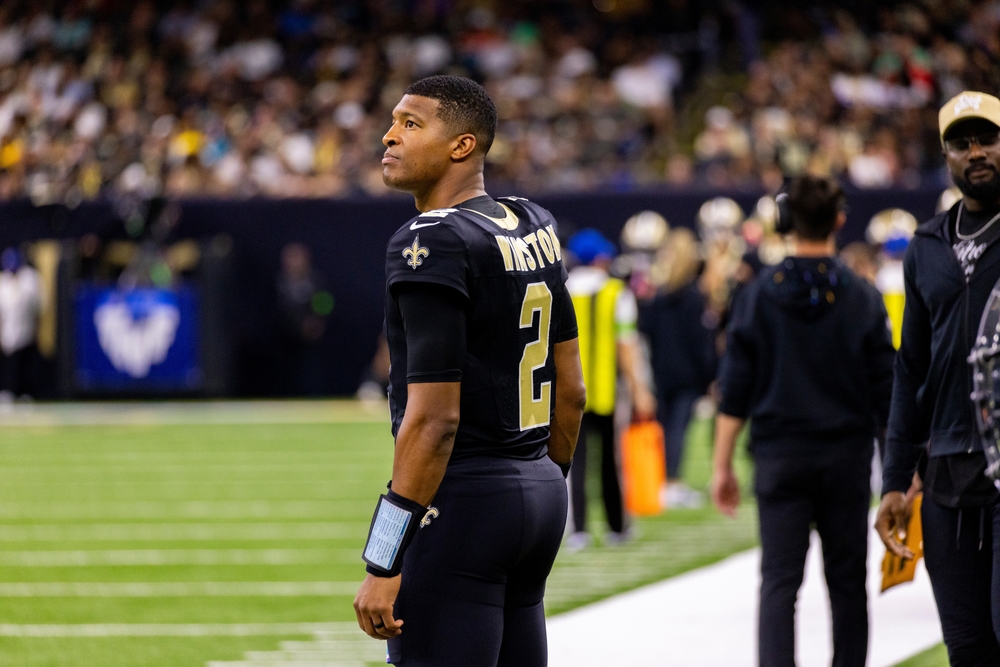 While his teammates were giving him flack on the sidelines, Jameis Winston and the Saints lined up in victory formation to take a knee, end the game and head home for the season.