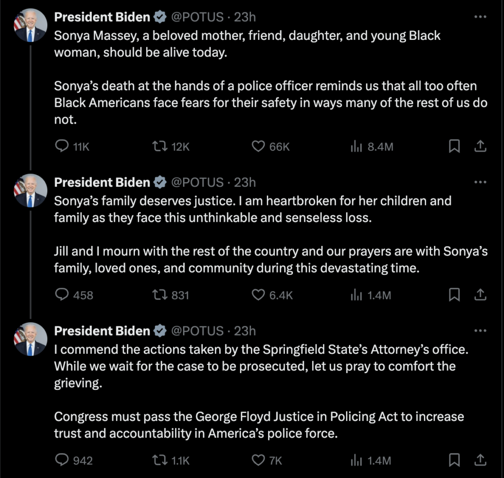 Harris joined President Biden in commending the State Attoryney’s Office and requesting Congress to pass the George Floyd Justice in Policing Act, which she coauthored in the Senate. Harris lastly announced that in honor of Sonya and others who have fallen before her, the public must unite to “achieve meaningful reforms that advance the safety of all communities.”