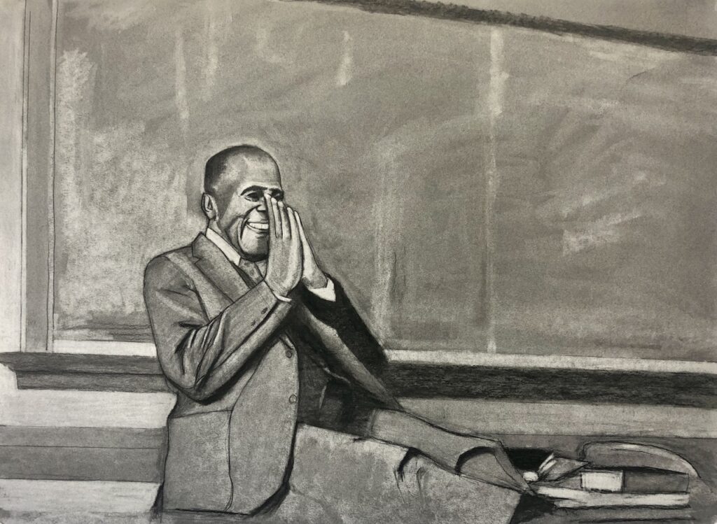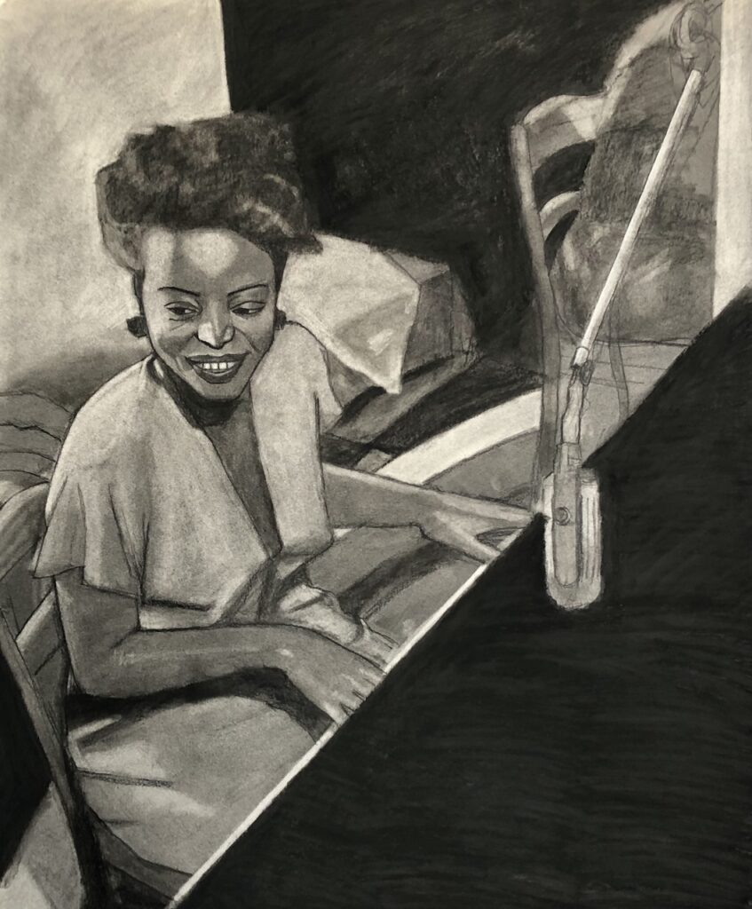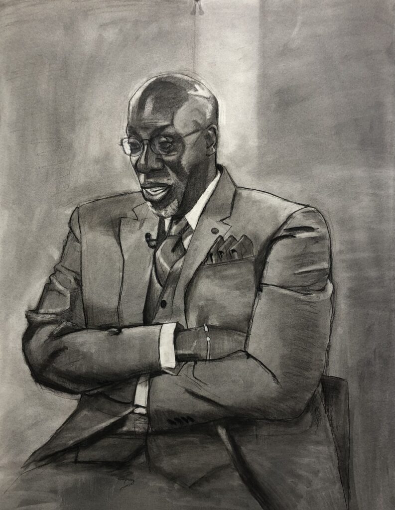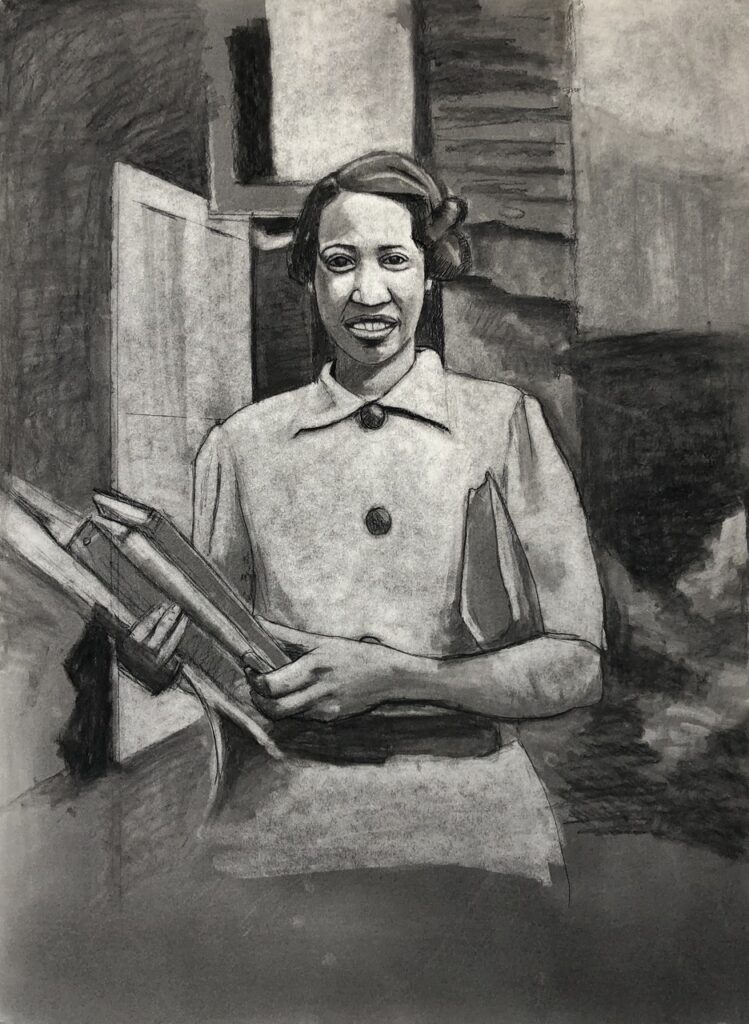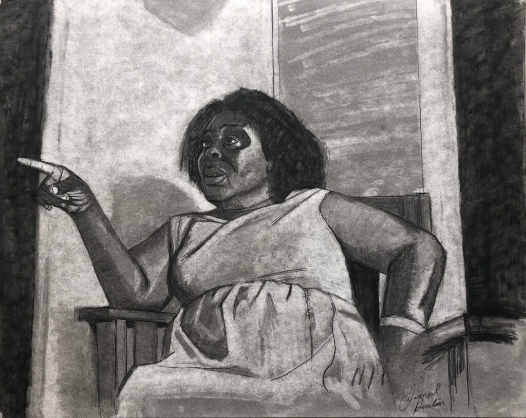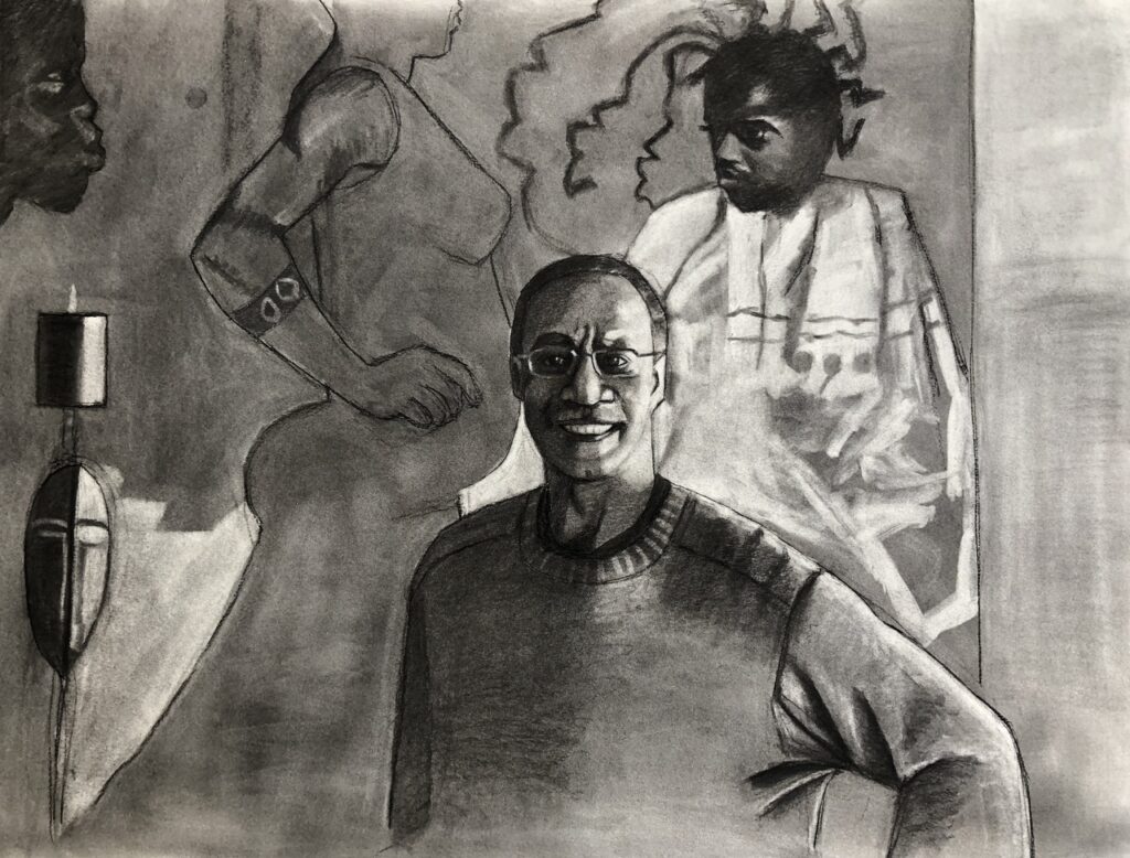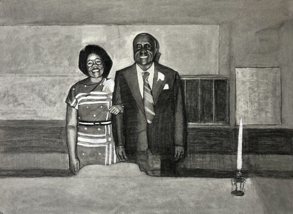 My recent portrait series has several portraits that are meaningful to me. However, the most meaningful one is the portrait of my grandparents, Ernest and Betty Paulin. In that portrait, I depict them standing shoulder to shoulder (a pose that always reminds me of Egyptian sculptures of royalty). That portrait features three focal points: my grandparents and the candle sitting on the table; the candle holds special significance to me as someone raised in the Catholic church and spent years as an altar server. I intentionally drew the candle in such a way that it appears to be glowing, which in Catholic theology is a symbol for the presence of God and spirit. This portrait is a prayer to my ancestors, a symbolic gesture that their spirits are always alive.