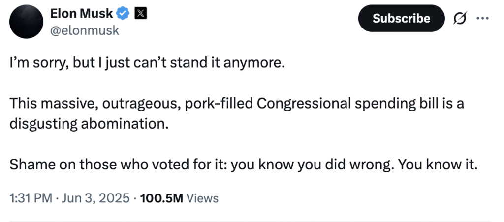 On Tuesday (June 3), Elon Musk sent the GOP into a tizzy after publicly rebuking the Trump administration’s “big, beautiful bill.”