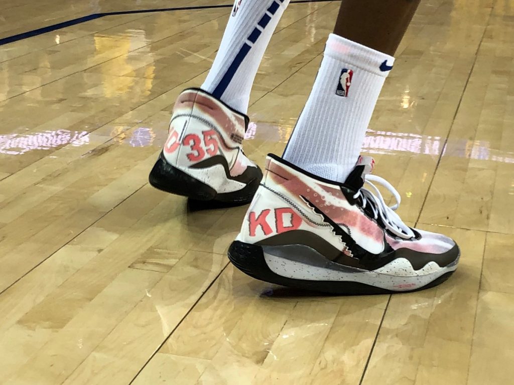 Durant started his quest for a third-straight NBA title by wearing a special edition of his KD 12s. Streetwear Designer Don C collaborated with Durant and Nike to create the “Movies” kicks. The design for 90s-themed shoes take inspiration from two of Durant’s favorite movies, “White Men Can’t Jump” and “Above the Rim.”