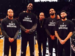 LeBron James and Kyrie Irving were among NBA players to wear black “I Can’t Breathe” t-shirts during warmups before a Nets-Cavaliers game in 2014. The phrase was some of the last words uttered by Garner before he died during a confrontation with New York police officers on Staten Island. Garner was placed in a chokehold by one of the cops.
