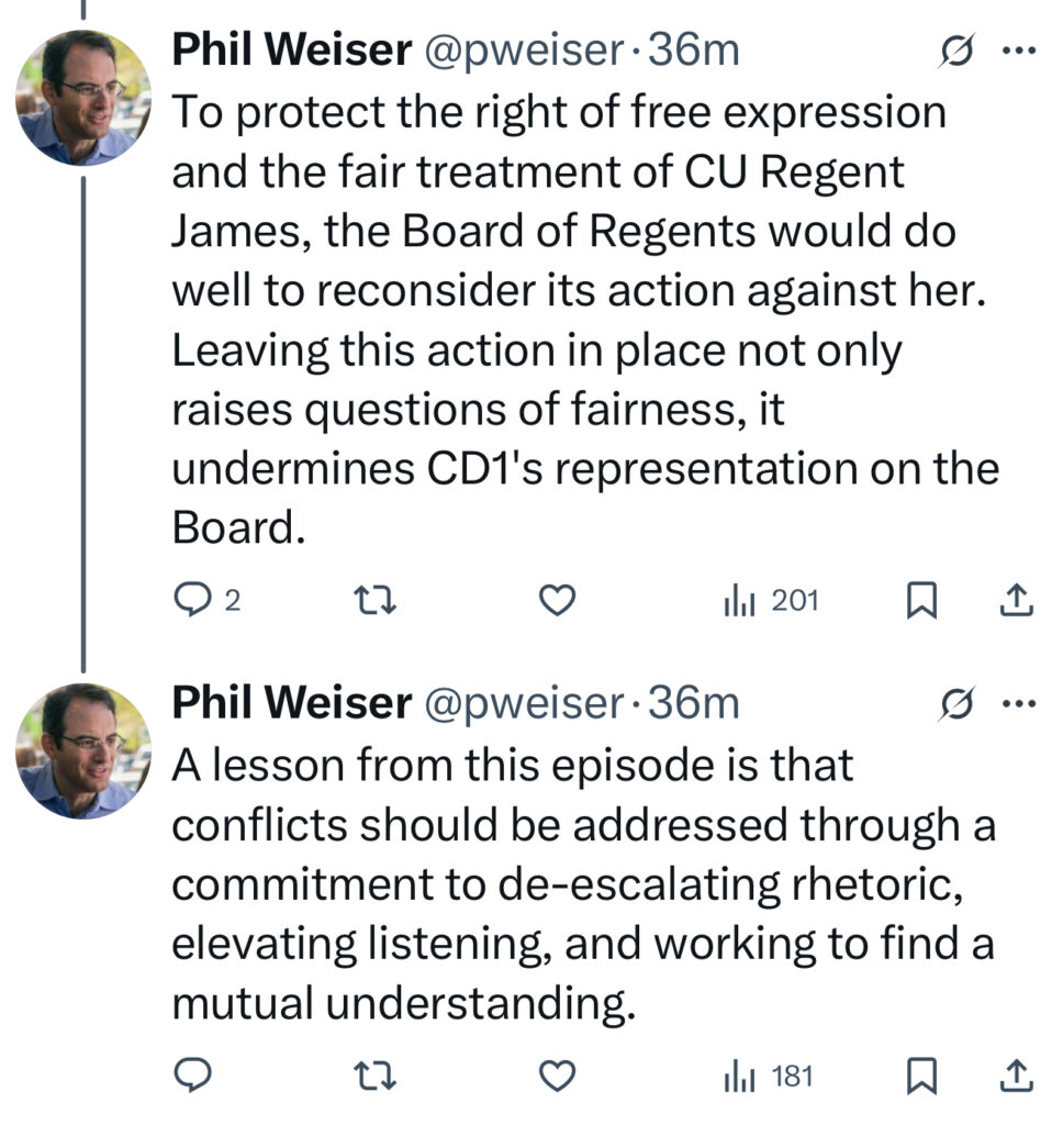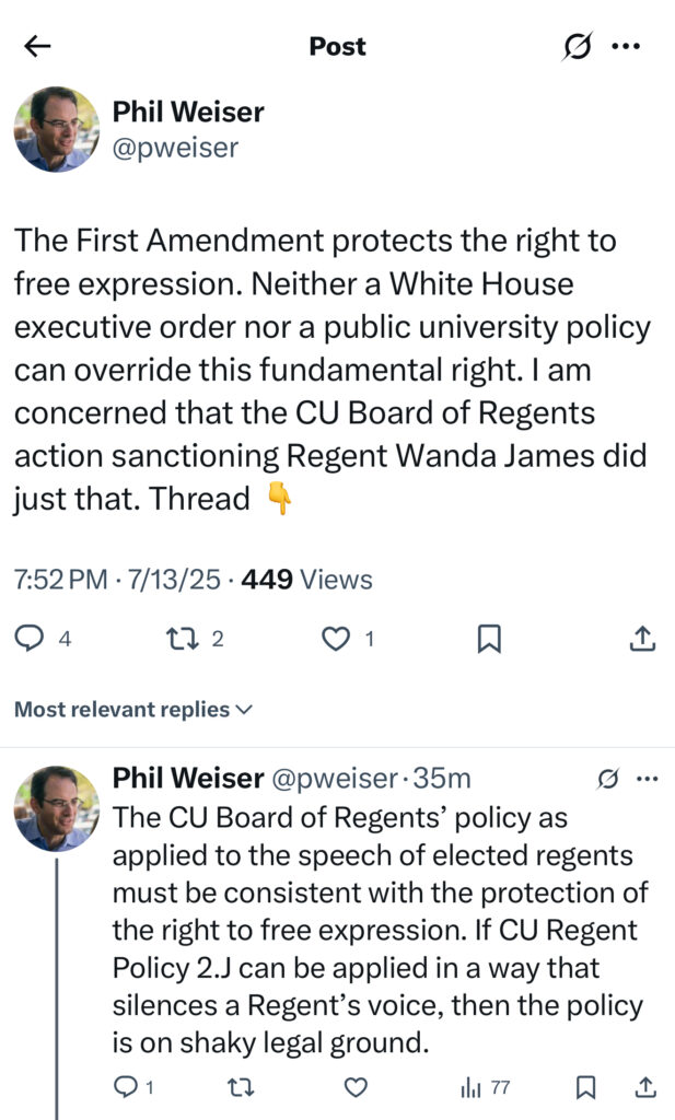 On Sunday night, July 13, 2025, Attorney General Phil Weiser, who was also running for Governor, posted a thread on X, formerly Twitter, acknowledging James’s First Amendment rights had been violated.