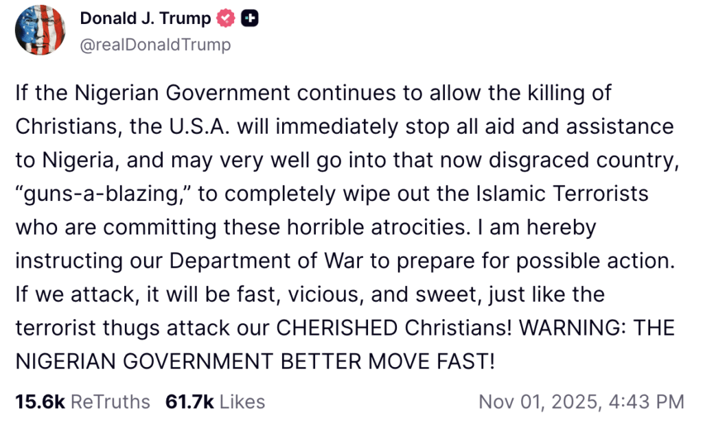 “If the Nigerian Government continues to allow the killing of Christians, the U.S.A. will immediately stop all aid and assistance to Nigeria, and may very well go into that now disgraced country, ‘guns-a-blazing,’ to completely wipe out the Islamic Terrorists who are committing these horrible atrocities,” Trump wrote on his Truth Social platform.