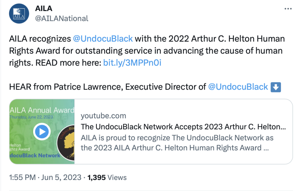 The UndocuBlack Network has been recognized by the American Immigration Lawyers Association (AILA) with the prestigious 2023 Arthur C. Helton Human Rights Award for outstanding service in advancing the cause of human rights.