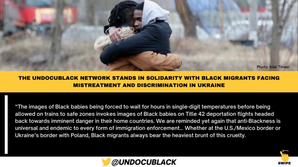 “As the immigrant rights community moves towards a unified call for welcoming Ukrainians fleeing the war and protecting Ukrainians in the U.S. from deportation, it would be irresponsible for any organization to not name the vulnerability of Black immigrants within this conflict.” — The UndocuBlack Network Team