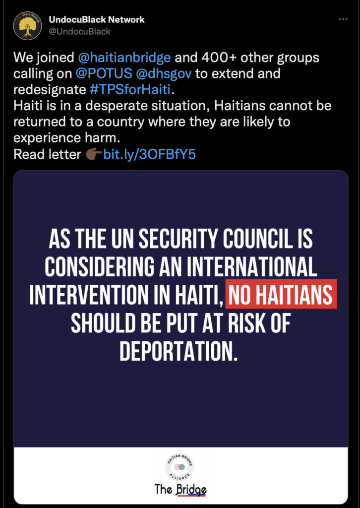 In a letter, the Haitian Bridge Alliance, UndocuBlack Network and over 400 other immigration, civil rights, human rights, and faith-based organizations, called on the Biden-Harris administration to extend and redesignate TPS for Haiti. Recently, sixteen U.S. senators agreed and released a letter calling for the same.